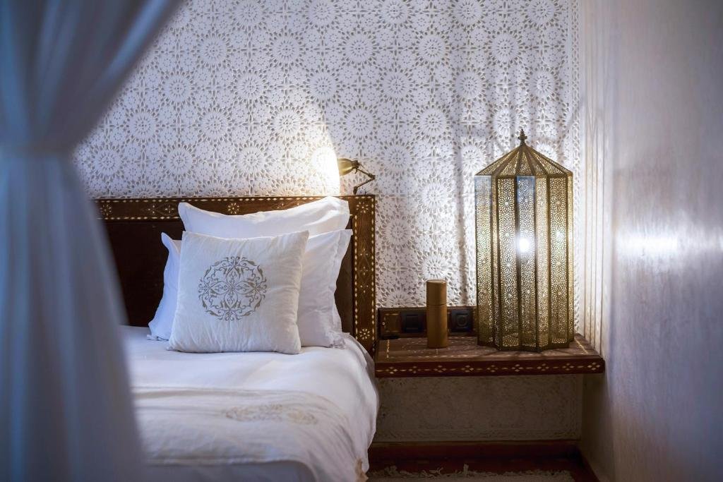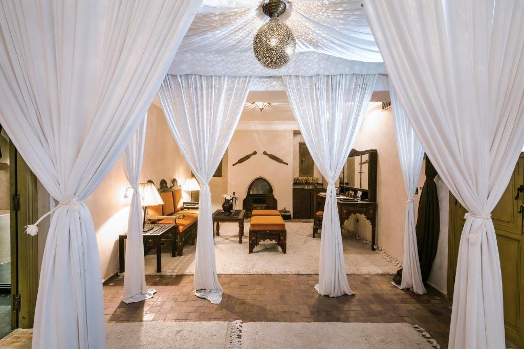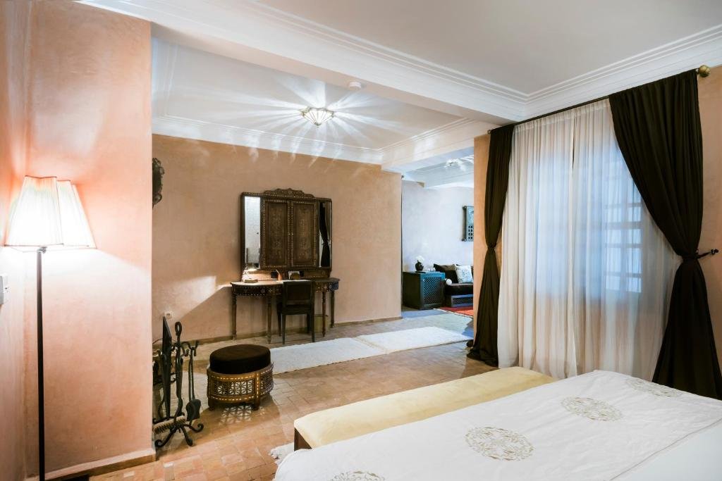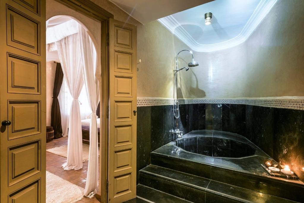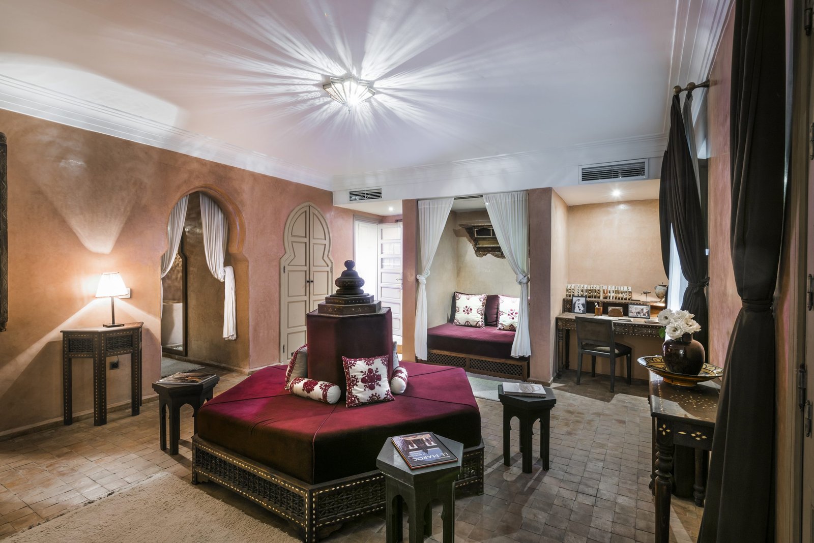 Overlooking the courtyard and providing direct access to a private space on the rooftop terrace, these large rooms (42-51 m²) showcase a unique Moroccan interior designed by Charles Kaisin. They feature oversized double beds, semi-circular fireplaces, and a seating area with intricately carved wooden furniture. The private bathrooms are spacious and include a walk-in shower and two sinks. Some rooms also have a marble bathtub.